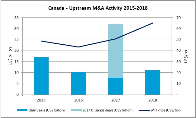 This US$11.2 billion appears a major drop from the total value of deals in 2017 (US$32.0 billion) – this value, however, was skewed by a handful of major oilsands sector deals in the first quarter worth a combined US$24.3 billion.