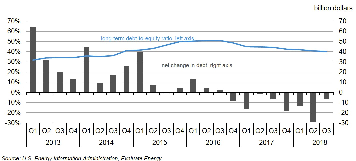 Of the group that the EIA studied for this quarterly review, a closer look at Evaluate Energy’s data shows that only five companies reduced debt by more than 10% in Q3 2018 compared to Q2 2018.