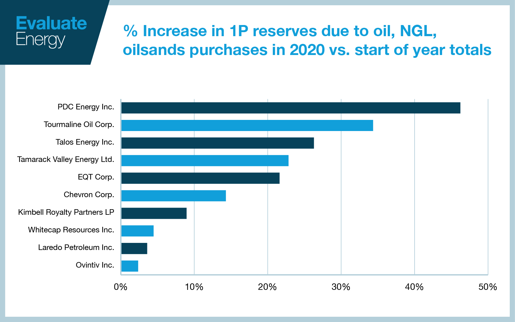 Evaluate Energy identified the 10 most transformed oil portfolios of 2020 by comparing the volume of barrels of proved (1P) oil, NGL and oilsands reserves added by each company via acquisition in the U.S. and Canada according to year-end reserve reports with North American reserve totals at the start of the year (1).